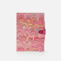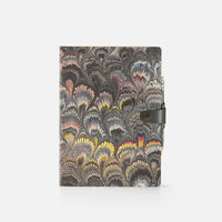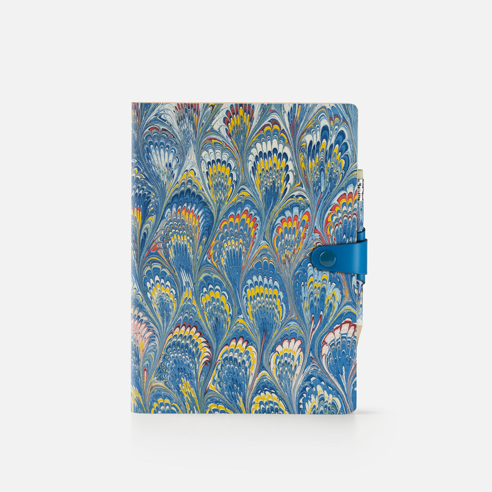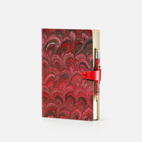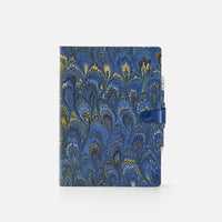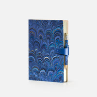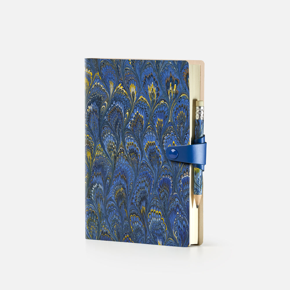 Agenda giornaliera con copertina in cotton paper decorato a mano, disegno pavone, chiusura "ricciolo" con bottone e matita - 12x17cm