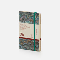 Agenda settimanale con copertina in cotton paper decorato a mano, disegno pavone, ed elastico in abbinamento