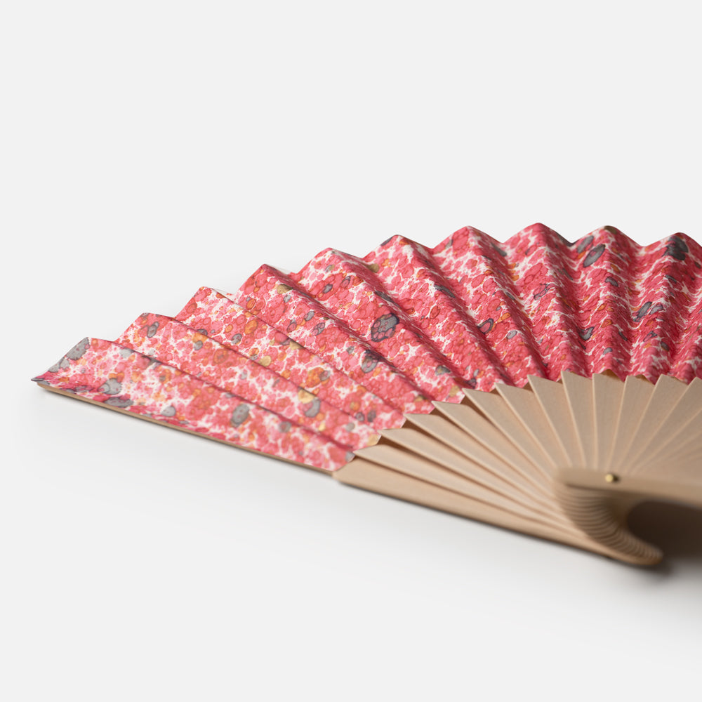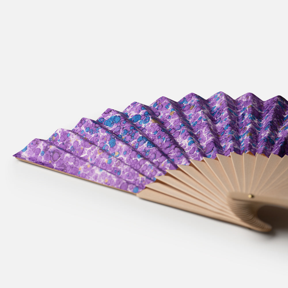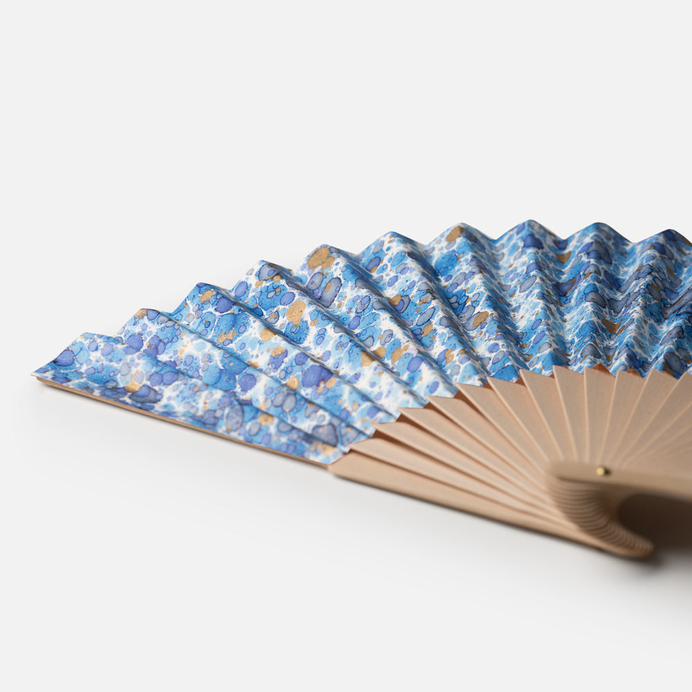 Ventaglio in carta marmorizzata con telaio in legno e scatola, disegno gocciolato.